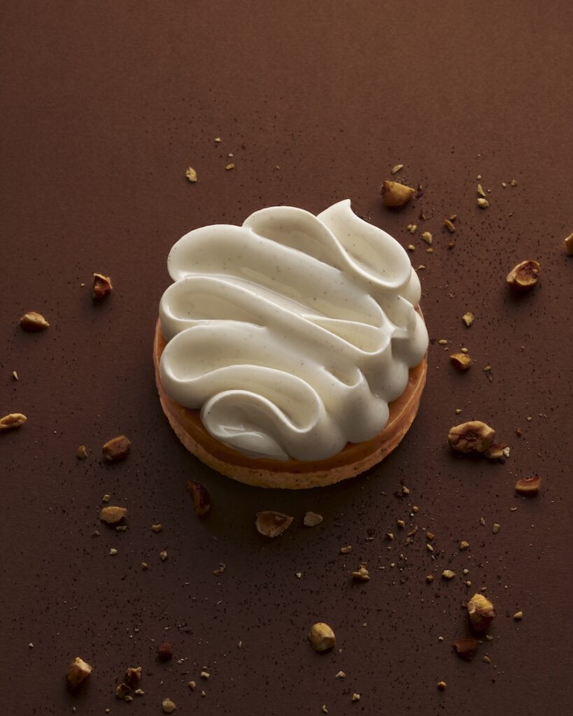 Butter Biscuit, Dacquoise Noisette, Praliné Café, Crémeux Noisette, Mousse Vanille.